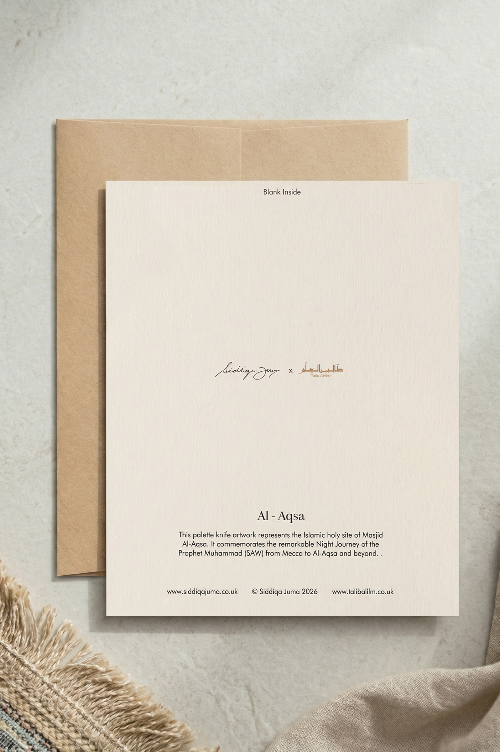 This palette knife artwork represents the Islamic holy site of Masjid Al-Aqsa. It commemorates the remarkable Night Journey of the Prophet Muhammad (SAW) from Mecca to Al-Aqsa and beyond.