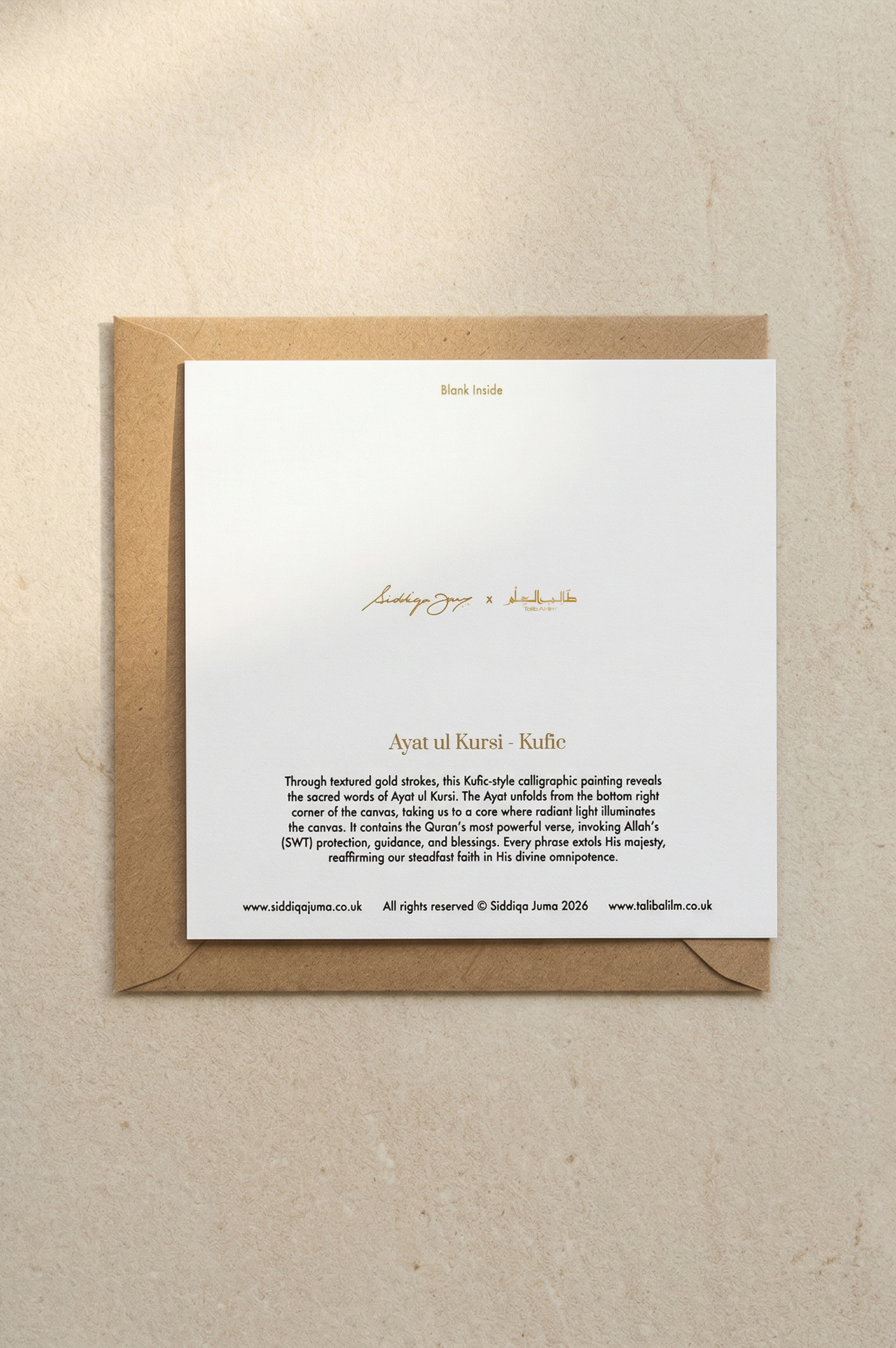 Through textured gold strokes, this Kufic-style calligraphic painting reveals the sacred words of Ayat ul Kursi. The Ayat unfolds from the bottom right corner of the canvas, taking us to a core where radiant light illuminates the canvas. It contains the Quran’s most powerful verse, invoking Allah’s (SWT) protection, guidance, and blessings. Every phrase extols His majesty, reaffirming our steadfast faith in His divine omnipotence.