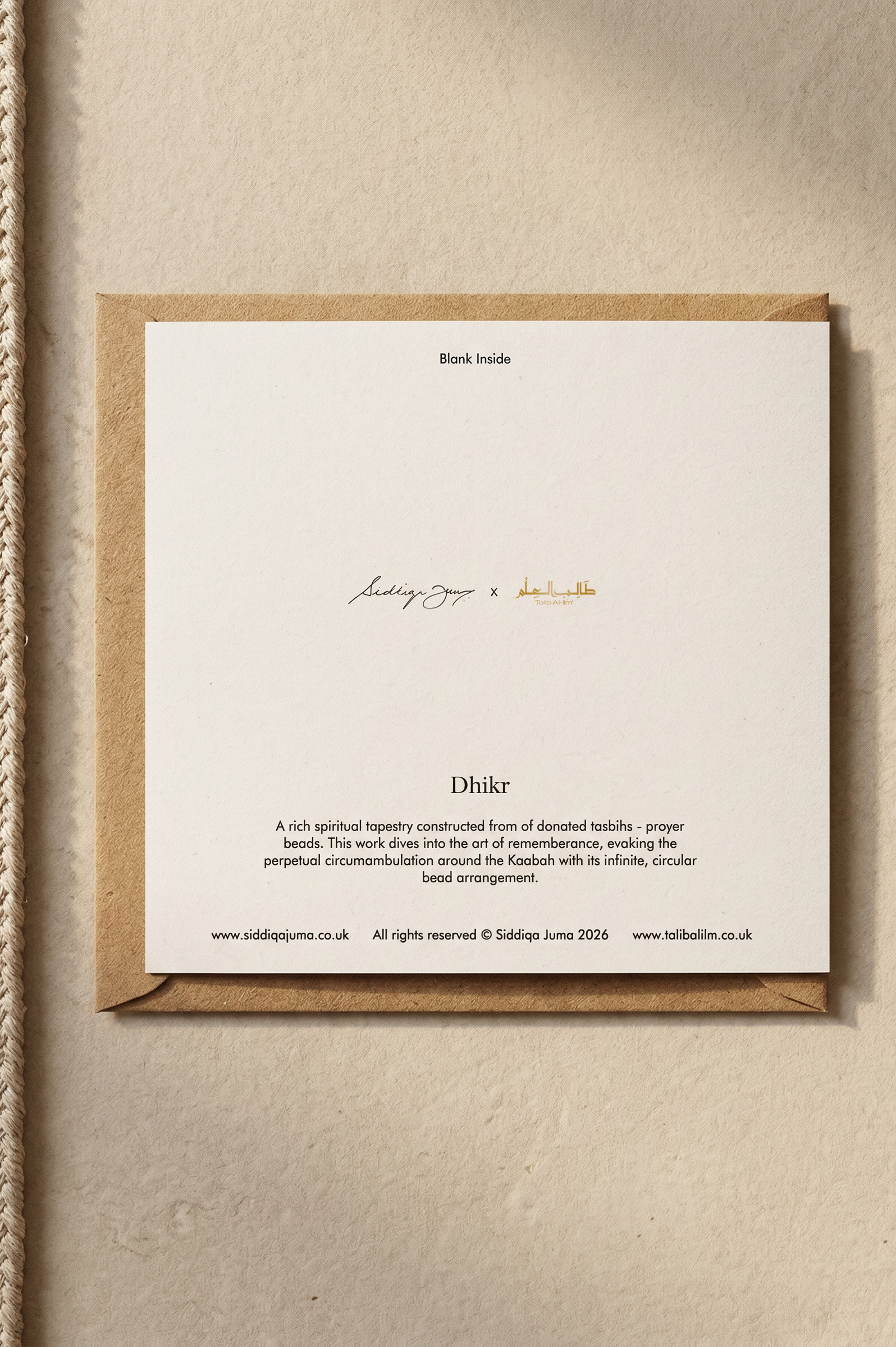 A rich spiritual tapestry constructed from donated tasbihs – prayer beads. This work dives into the art of remembrance, evoking the perpetual circumambulation around the Kaabah with its infinite, circular bead arrangement.
