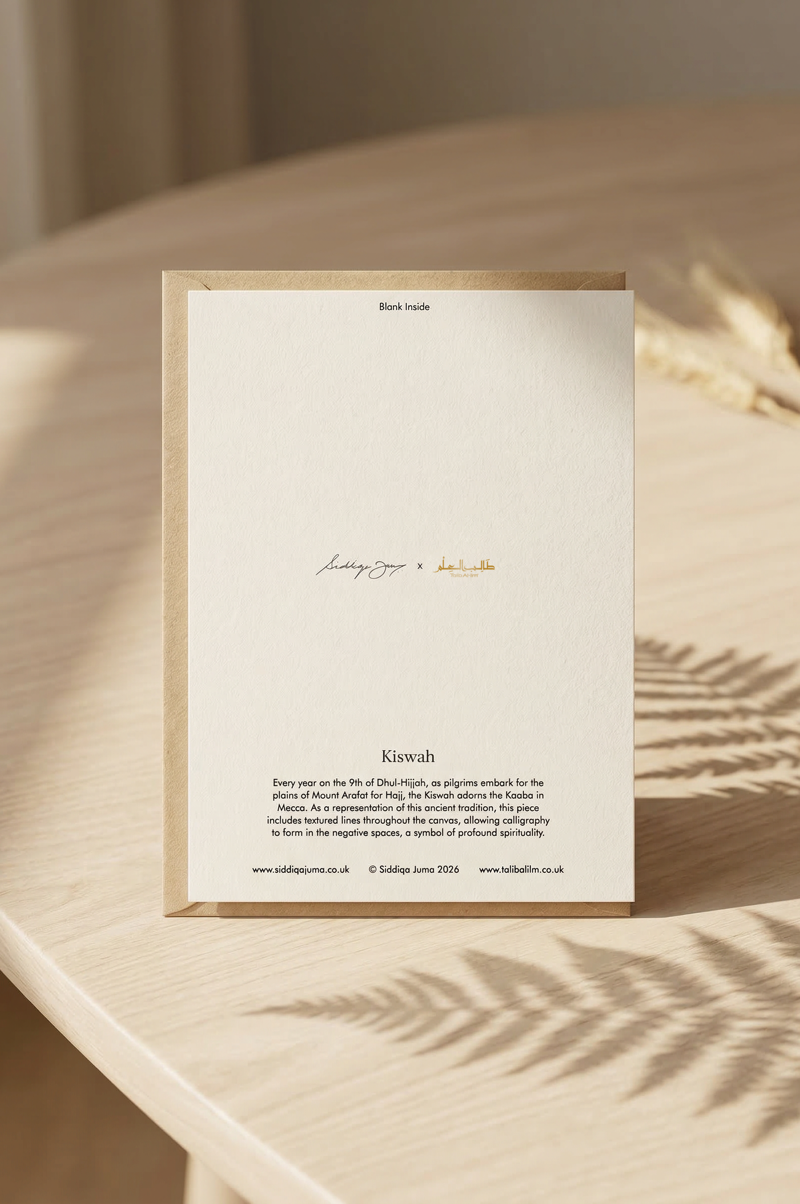 Every year on the 9th of Dhul-Hijjah, as pilgrims embark for the plains of Mount Arafat for Haji, the Kiswah adorns the Kaaba in Mecca. As a representation of this ancient tradition, this piece includes textured lines throughout the canvas, allowing calligraphy to form in the negative spaces, a symbol of profound spirituality