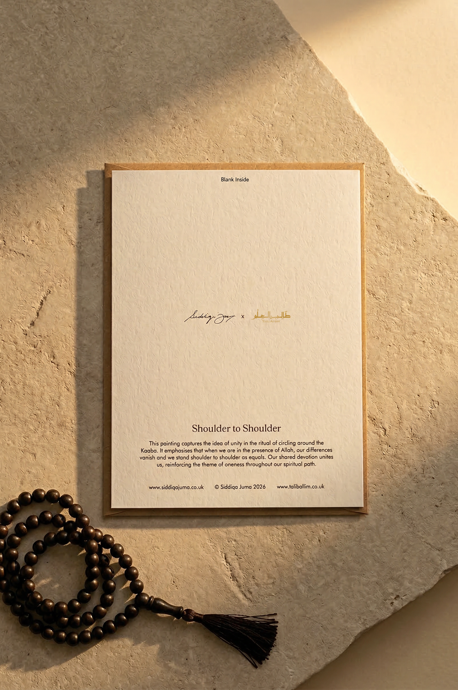 This painting captures the idea of unity in the ritual of circling around the Kaaba. It emphasises that when we are in the presence of Allah, our differences vanish and we stand shoulder to shoulder as equals. Our shared devotion unites us, reinforcing the theme of oneness throughout our spiritual path.