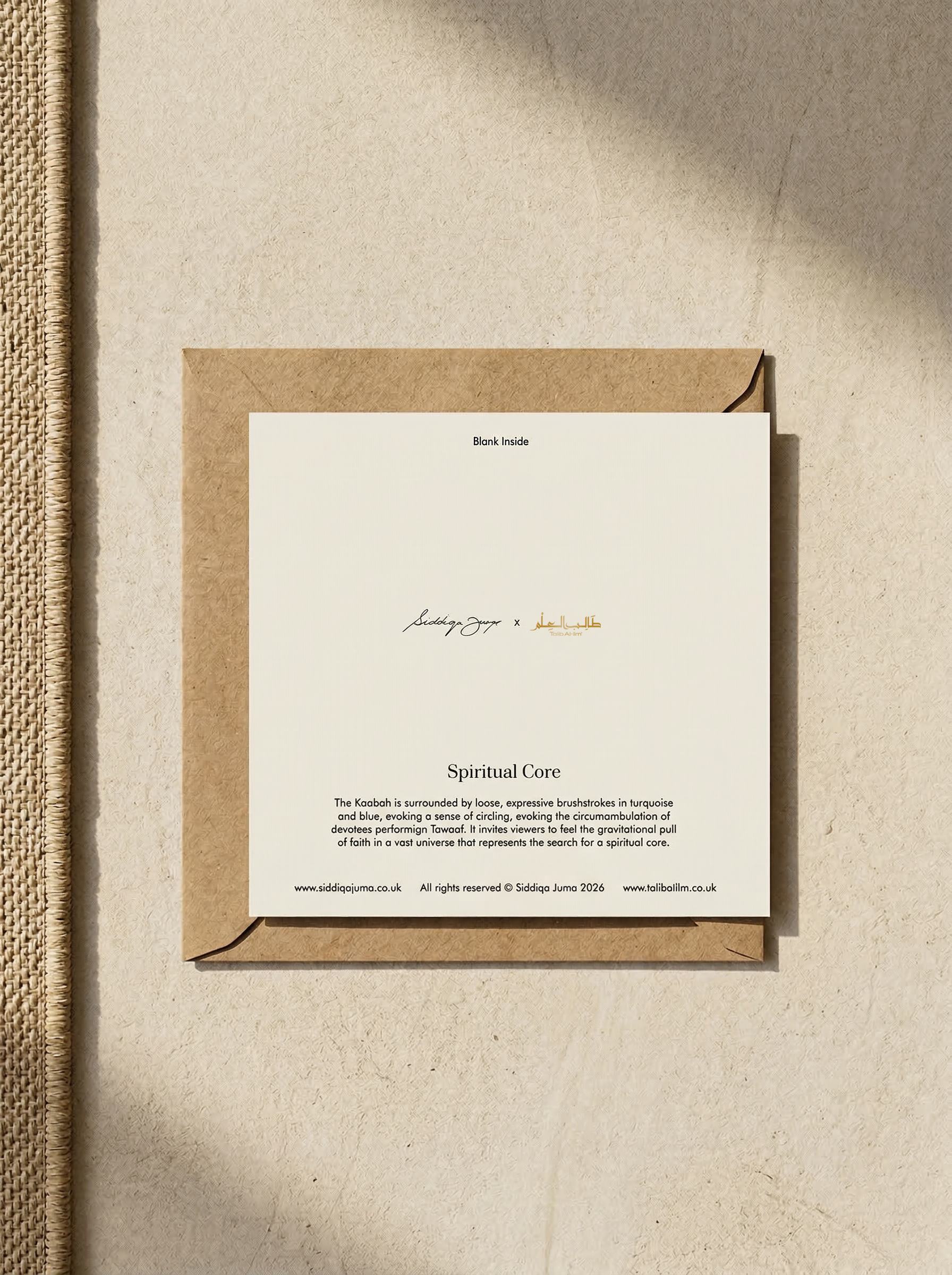 The Kaabah is surrounded by loose, expressive brushstrokes in turquoise and blue, evoking a sense of circling, evoking the circumambulation of devotees performing Tawaaf. It invites viewers to feel the gravitational pull of faith in a vast universe that represents the search for a spiritual core.