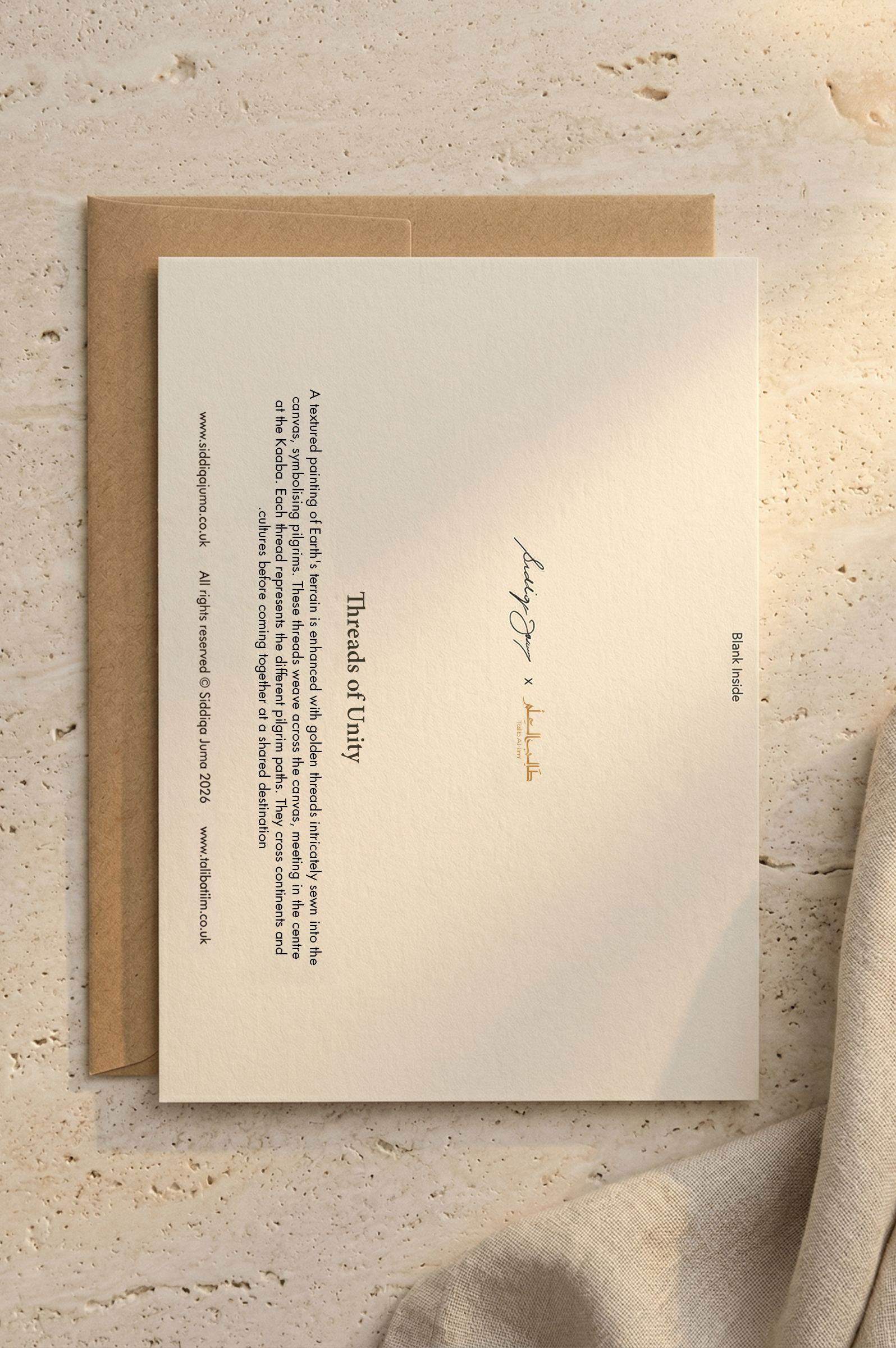 A textured painting of Earth’s terrain is enhanced with golden threads intricately sewn into the canvas, symbolising pilgrims. These threads weave across the canvas , meeting in the centre at the Kaaba. Each thread represents the different pilgrim paths. They cross continents and cultures before coming together at a shared destination.